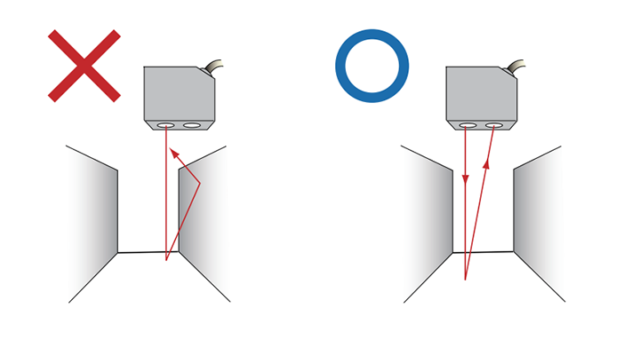 感應(yīng)頭周圍存在壁面時,投射激光經(jīng)過壁面反射回的亂光會導(dǎo)致測量的偏差。若安裝環(huán)境限制使得傳感器必須緊挨著壁面安裝時,請將傳感器的投光光軸和受光光軸構(gòu)成的平面平行于壁面。且將壁面處理為低反射率的黑色表面,以降低壁面的反射光量。
