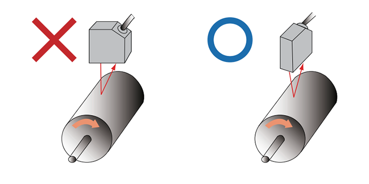 測量旋轉(zhuǎn)物體時,請將傳感器的投光光軸和受光光軸構(gòu)成的平面平行于旋轉(zhuǎn)物體的旋轉(zhuǎn)軸,這樣可以最大程度的抑制旋轉(zhuǎn)物體上下晃動或位置偏移所帶來的影響。