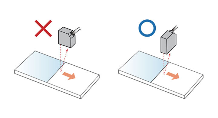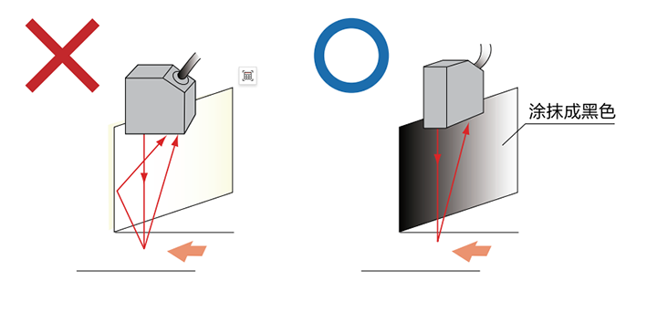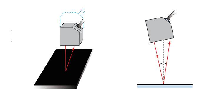 被測物為黑色物體時,反射光量較少,使得受光素子的受光量較少,導(dǎo)致分辨率下降??梢酝ㄟ^縮短檢測距離,讓有效測量范圍內(nèi)盡可能的縮短傳感器的檢測距離,確保受光素子接收到足夠的受光量。也可以【正反射】方式傾斜安裝,時激光的入射角等于反射角,這樣提高受光素子接收的受光量。