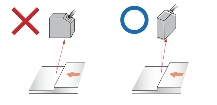 被測物的表面存在段差的情況時,請將傳感器的投光光軸和受光光軸構(gòu)成的平面平行于段差的邊緣區(qū)域?qū)y量的影響。