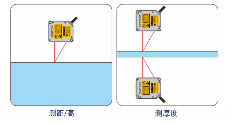 測(cè)距、測(cè)高是比較簡(jiǎn)單的應(yīng)用,傳感器輸出的數(shù)據(jù)可以直接使用,測(cè)厚則需要進(jìn)行計(jì)算,將兩個(gè)激光傳感器在固定的距離L進(jìn)行安裝,讀取兩個(gè)距離A和B,厚度H=L-A-B。