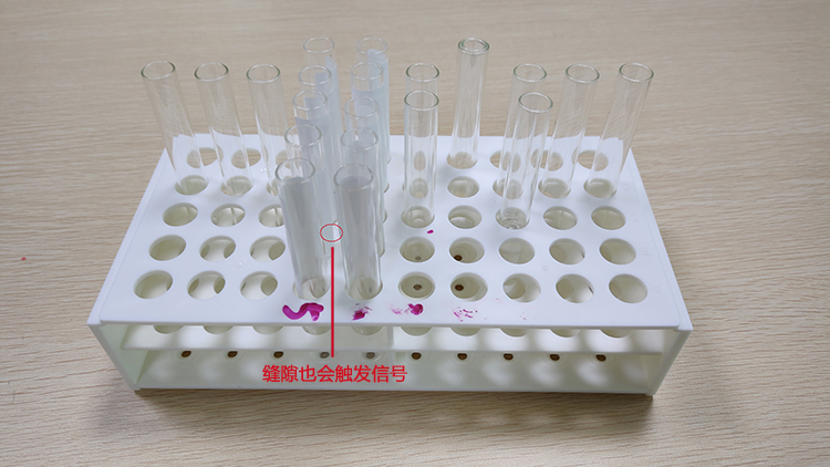 技術分析知道,是環(huán)境光產生了變化,造成的影響。滿排的試管和零星不滿排的試管分布排的環(huán)境光的比較大的差別,影響光電開關的正常檢測。知道了原因之后,ECOTTER技術人員給出了兩種解決方案,第一種是在沒有背景的檢測環(huán)境增加檢測背景,比如在傳感器到被檢測物試管后面加一塊擋板,平衡環(huán)境光。