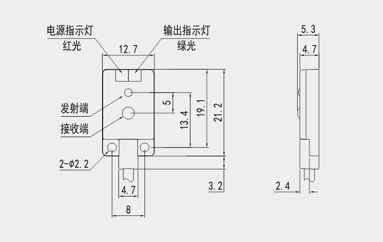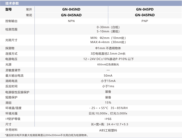 超薄型光電開關GN-045D系列采用小光斑尺寸設計,檢測距離達到30mm,30mm處光斑僅為3*3mm; 配備方便觀察的雙色指示燈一一紅色電源指示燈與綠色輸出指示燈。