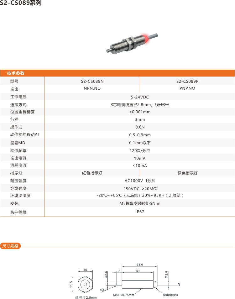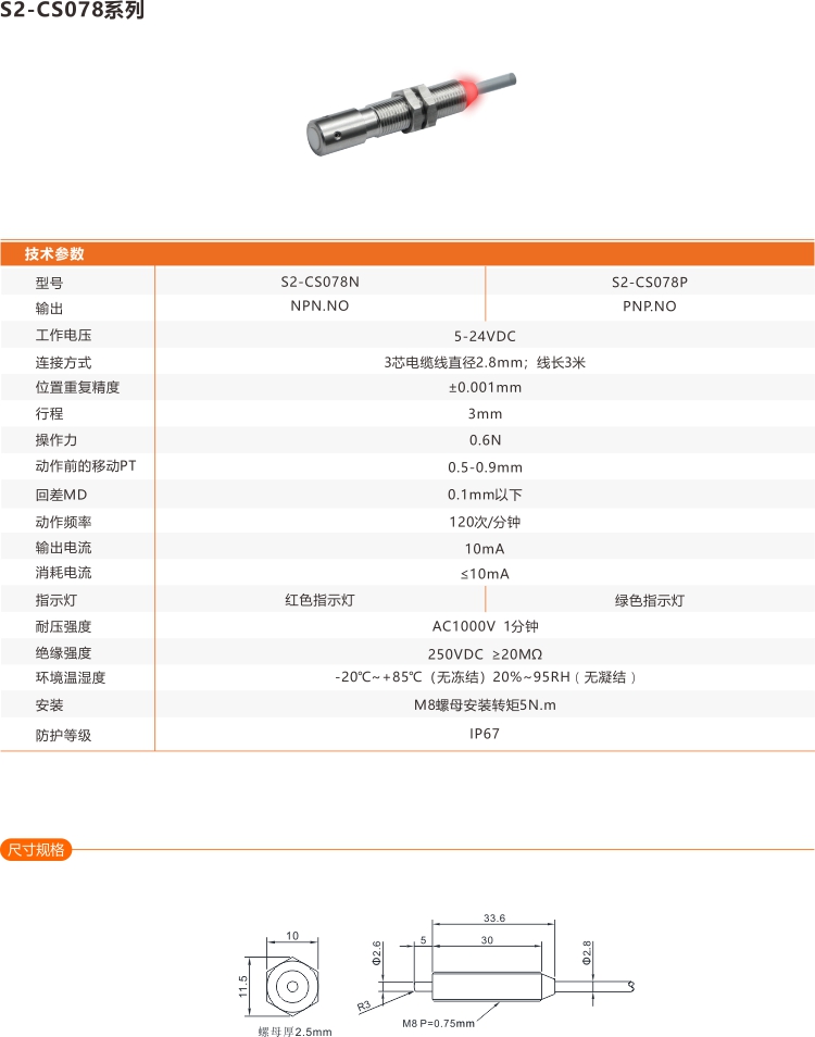 ECOTTER S2-CS 接觸定位開關(guān)是一種機(jī)械式位置檢測裝置,當(dāng)物體與開關(guān)的接觸部件發(fā)生物理接觸時,開關(guān)會改變其電氣狀態(tài)(通/斷)。