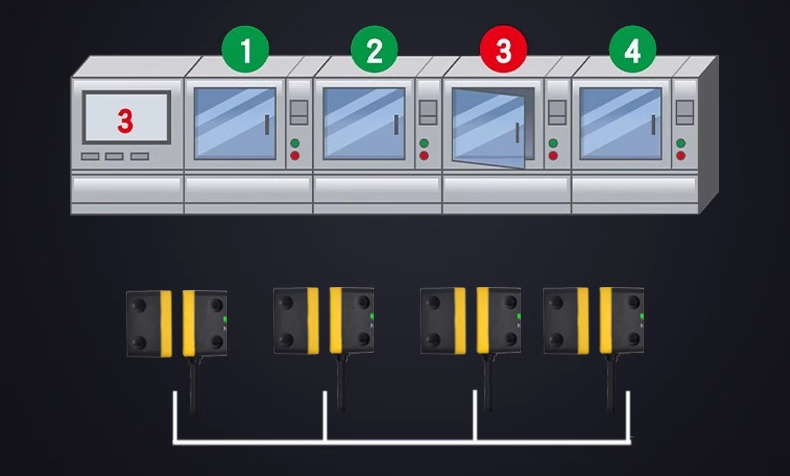 多個(gè)門(mén)通過(guò)級(jí)聯(lián)連接,可實(shí)現(xiàn)統(tǒng)一的安全輸出。確認(rèn)是否有其中一扇門(mén)的開(kāi)閉狀態(tài)不正常。
