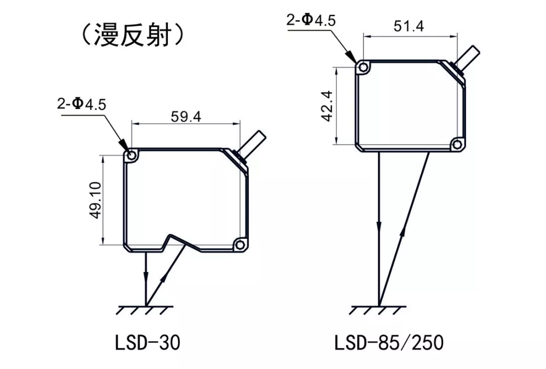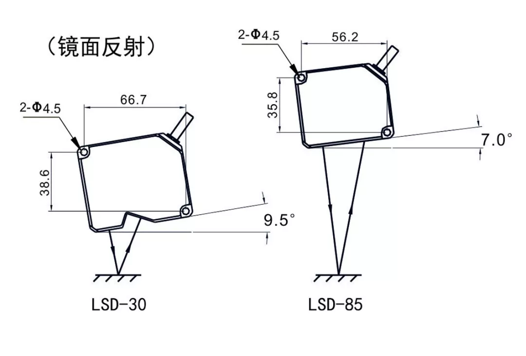 對鏡面反射表面的檢測,請保證投光部的面與測定對象物成一定夾角,使發(fā)射的激光經(jīng)測定物反射后進(jìn)入受光部。