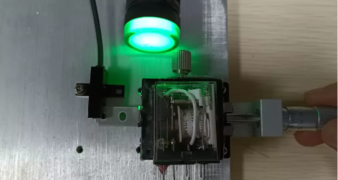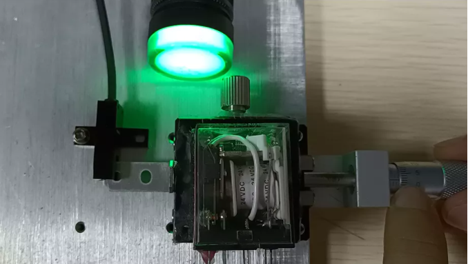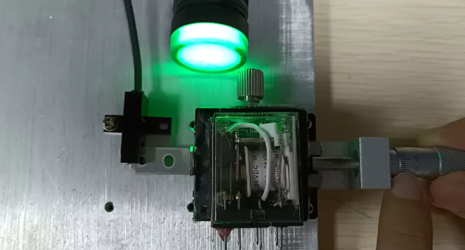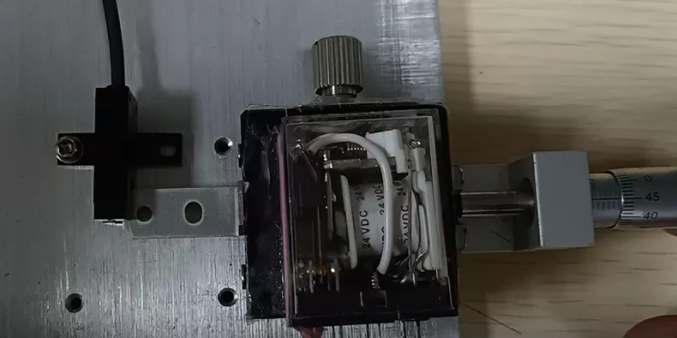 這里有一個(gè)重復(fù)精度測(cè)試儀器,我們可以通過(guò)旋動(dòng)標(biāo)尺推動(dòng)另一端的物塊前進(jìn),直到傳感器發(fā)出信號(hào),此時(shí)我們記錄下這個(gè)標(biāo)尺的位置。