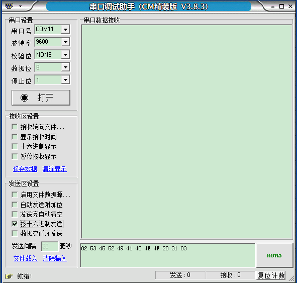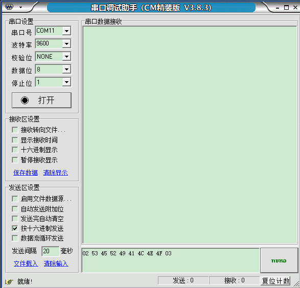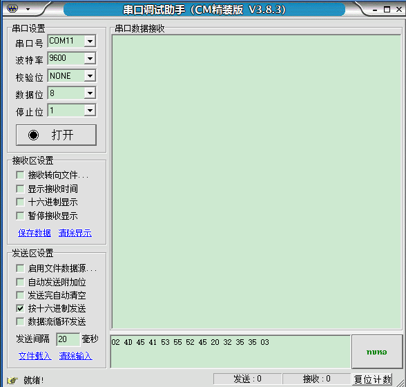 ④在需要發(fā)送的字符串前加 02,字符串后加 03,字符串成為 02 4D 45 41 53 55 52 45 20 32 35 35 03;